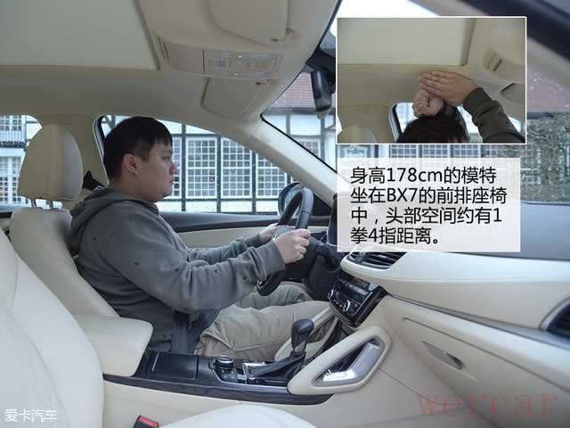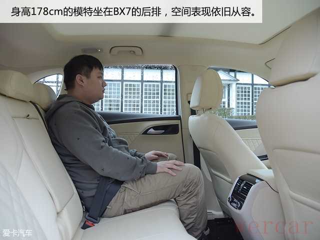 宝沃BX7的乘坐空间比较大,身高178cm的模特无论是坐在前排还是后排都十分从容,特别是头部空间更为充裕。