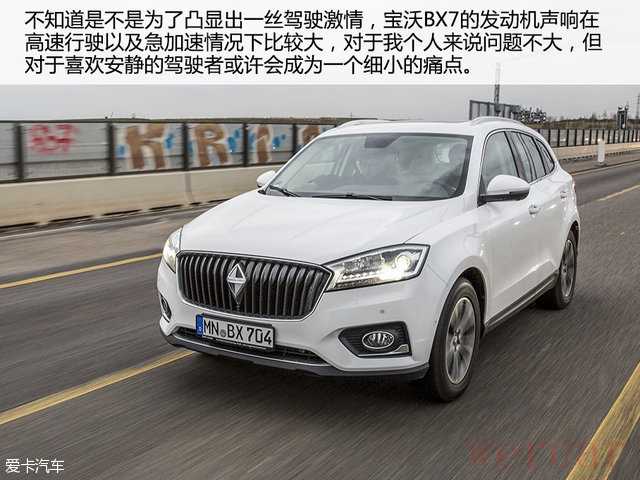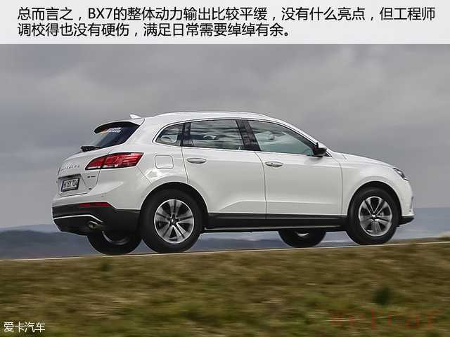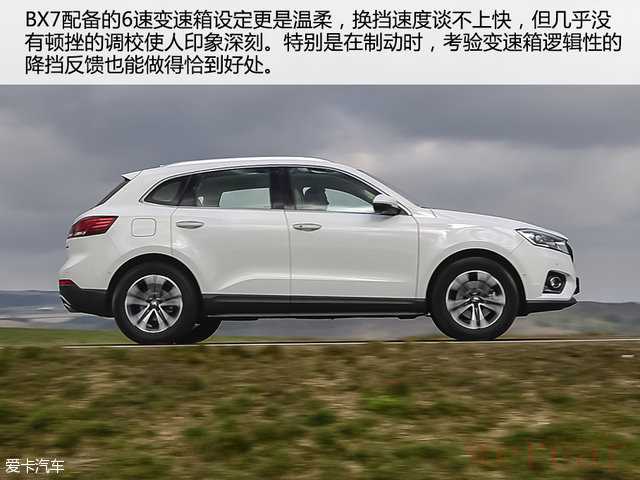 BX7的动力数据虽然比较喜人,而它的动力反馈也很强,但绝算不上激进。无论是从静止起步,还是中短突然提速,它的油门设定都十分灵敏,轻点一下油门,转速就会快速达到你所需要的区间,不会有很明显的突兀感,从而影响乘坐体验。BX7配备的6速变速箱设定更是温柔,换挡速度谈不上快,但几乎没有顿挫的调校使人印象深刻。特别是在制动时,变速箱逻辑降挡反馈也能做到恰到好处。总而言之,BX7的整体动力输出比较平缓,没有什么亮点,但工程师调校得也没有硬伤,满足日常需要绰绰有余。