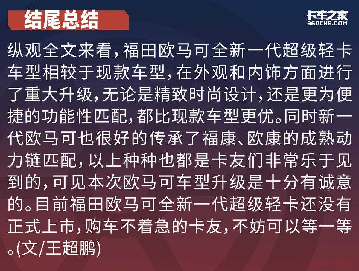 作为国内高端轻卡头部品牌,福田欧马可也曝光了旗下全新一代超级轻卡车型(以下简称新一代欧马可),那么这款车型究竟新在哪?有何亮点匹配?本文将通过与现款欧马可S1车型对比,来告诉卡友们上述问题的答案。