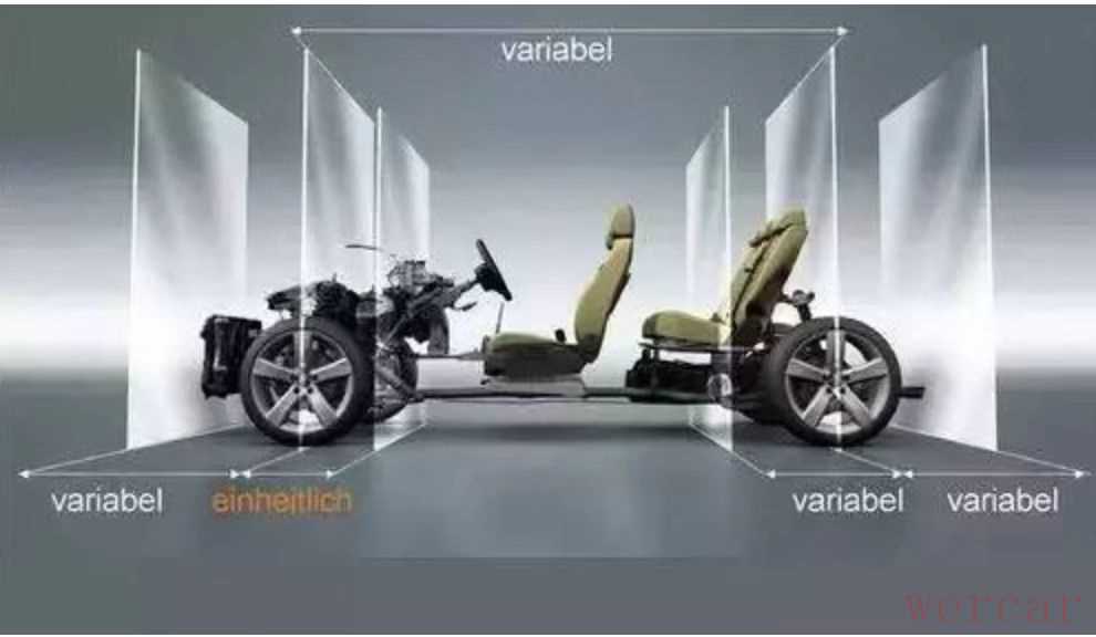 MQB模块化平台的基础就是发动机模块的位置是统一的,也就是油门踏板距离前轮中心的距离是相同的,发动机安装倾角也是相同的,无论汽油机还是柴油机。因此 EA211和EA288均为反置布局,发动机倾角均为向后12度。在发动机模块位置固定的基础上,MQB平台可对具体的轴距,轮距、前后悬长度等车身尺寸参数均属于变量可调,从而实现在一条生产线上可以实现多款车型的总装。