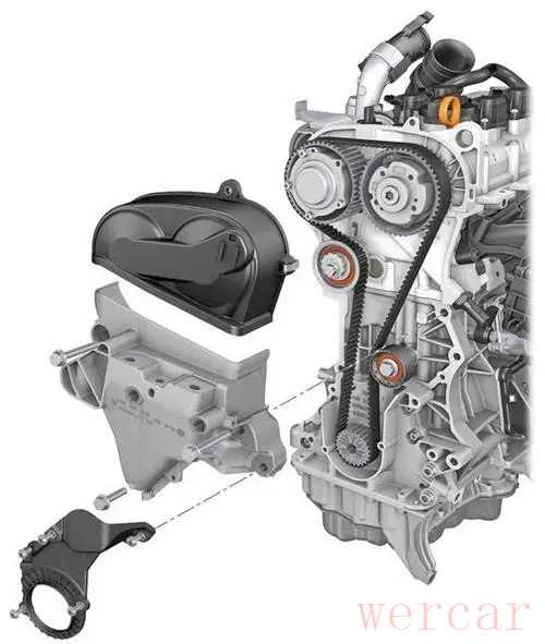 EA211发动机使用的就是正时皮带,其正时皮带由大陆集团(Continental)提供,设计寿命达到了30万公里,理论上可做到如同链条一样终身免维护。当然了,由于皮带的工作环境对皮带的使用寿命会造成直接影响,如果机油从密封处渗入正时皮带室会对皮带造成腐蚀,从而大大缩减其使用寿命,因此大众对于正时皮带仍然给出了9万公里首保,之后每3万公里检查的技术保养要求。