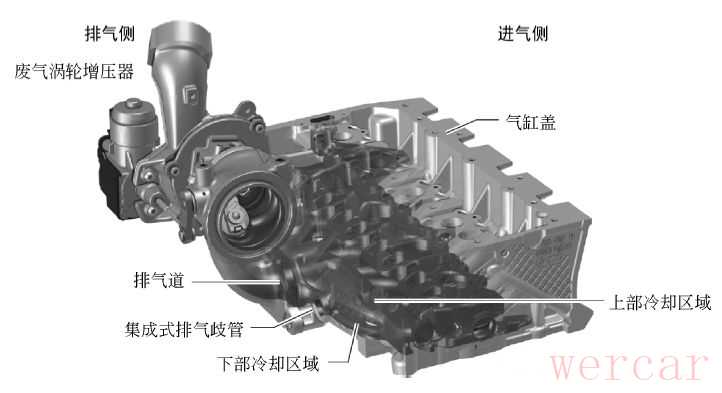 以往的热车单纯靠发动机的温度,这样热车时间会比较长,排气歧管集成到汽缸盖后,冷车时排气歧管的高温可以加热防冻液,从而缩短热车时间。