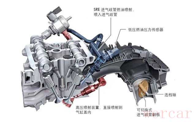 SRE进气歧管喷射(缸外喷射)也就是喷油嘴安装在进气歧管上,不直接将汽油喷入气缸内,而是在空气进入气缸之前,喷油嘴即喷出汽油与之混合后再进入气缸。进气歧管喷射可以让燃油油液有充分的雾化时间并与空气混合,有利于充分燃烧,减少颗粒物、二氧化碳排放。不过该喷射方式会在进气门和进气道上形成液态油膜,容易造成发动机无法“精确控制”瞬时供油量,造成浪费。