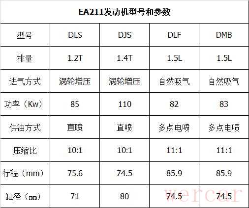 国内EA211发动机系列,主要包括1.4T DJS、1.2T DLS、1.5L DMB、1.5L DLF等四个型号,对应不同的排量、功率、扭矩、供油方式,排放均满足国6B标准。