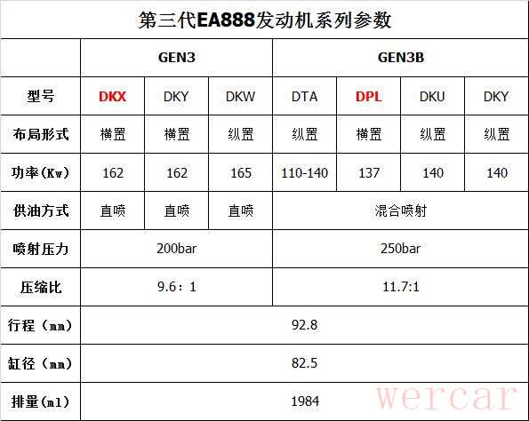 第三代EA888发动机又包含不同批次的多个型号机型,其动力参数、环保标准、供油方式等均有区别。搭载在帕萨特和迈腾330TSI车型上的发动机型号为DPL,为2.0T排量,最大马力186Ps,满足国6b排放标准的EA888发动机 ,供油方式采用了混合喷射。
