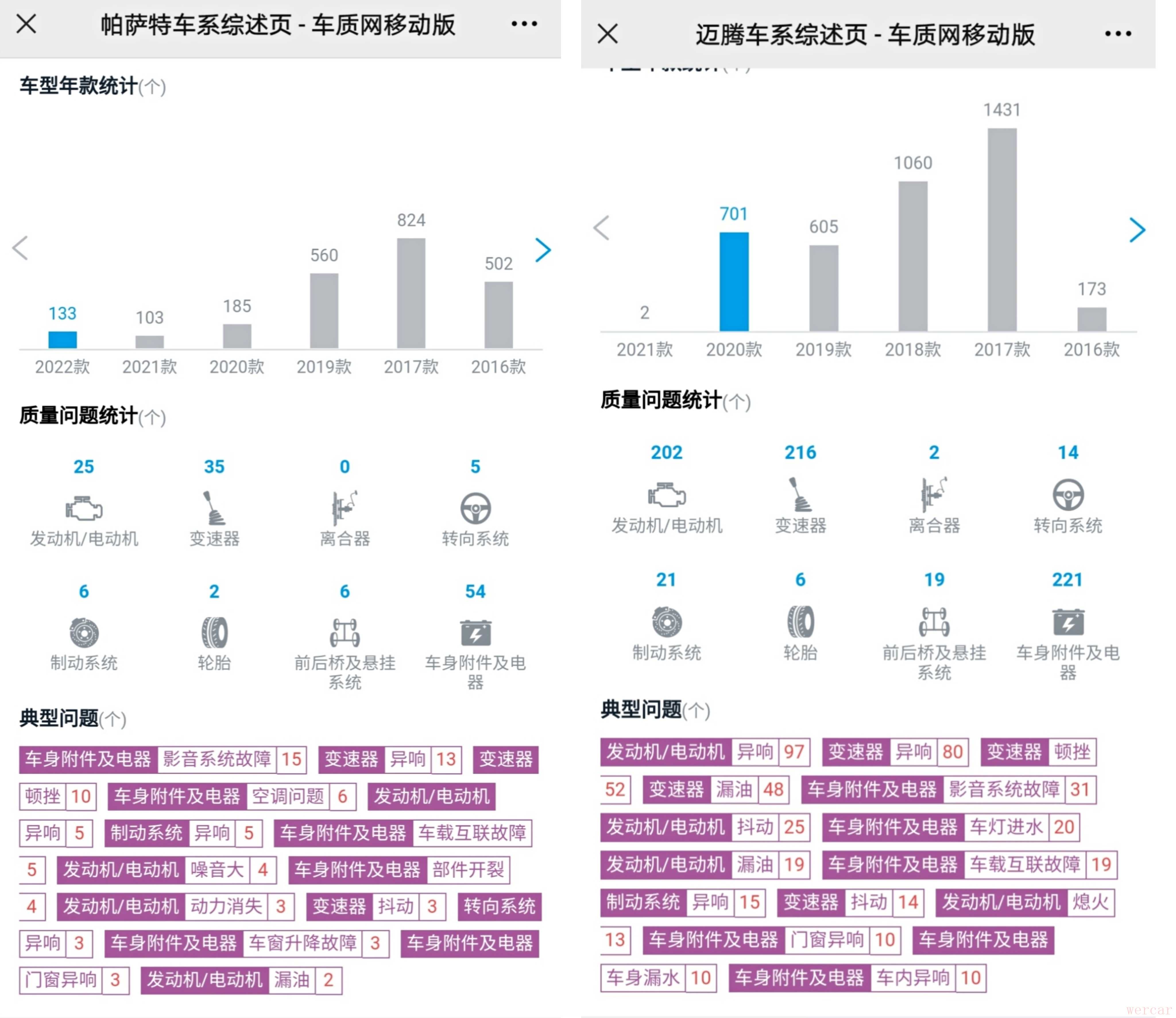 通过第三方汽车大型质量反馈平台车质网的数据,关于迈腾和帕萨特的投诉以车身附件和电器、发动机、变速箱三方面的问题为主,帕萨特发动机方面的投诉,在总投诉量当中所占比例在18%左右,迈腾在29%左右,主要问题为异响或噪音大,抖动、漏油等。
