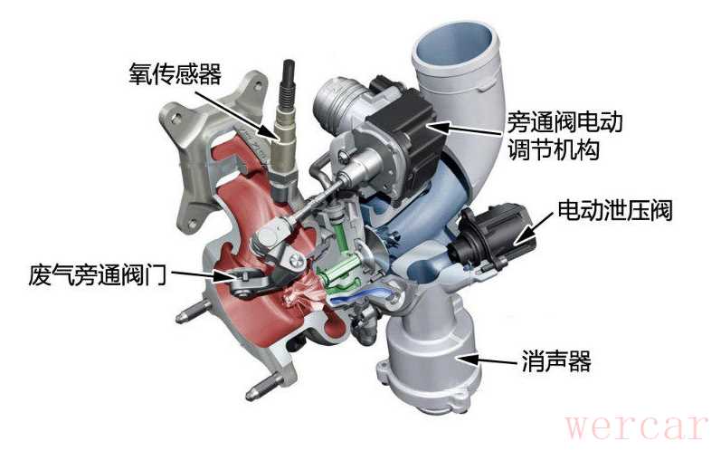 涡轮增压组件除了采用可耐高温的新合金材料(可以承受高达980℃的排气温度)的增压器涡轮叶片之外,还采用了电动的废气旁通控制阀和电动泄压阀。相对于之前被动的真空旁通阀,对于阀门的开启和关闭控制得更为快速、更为精准。