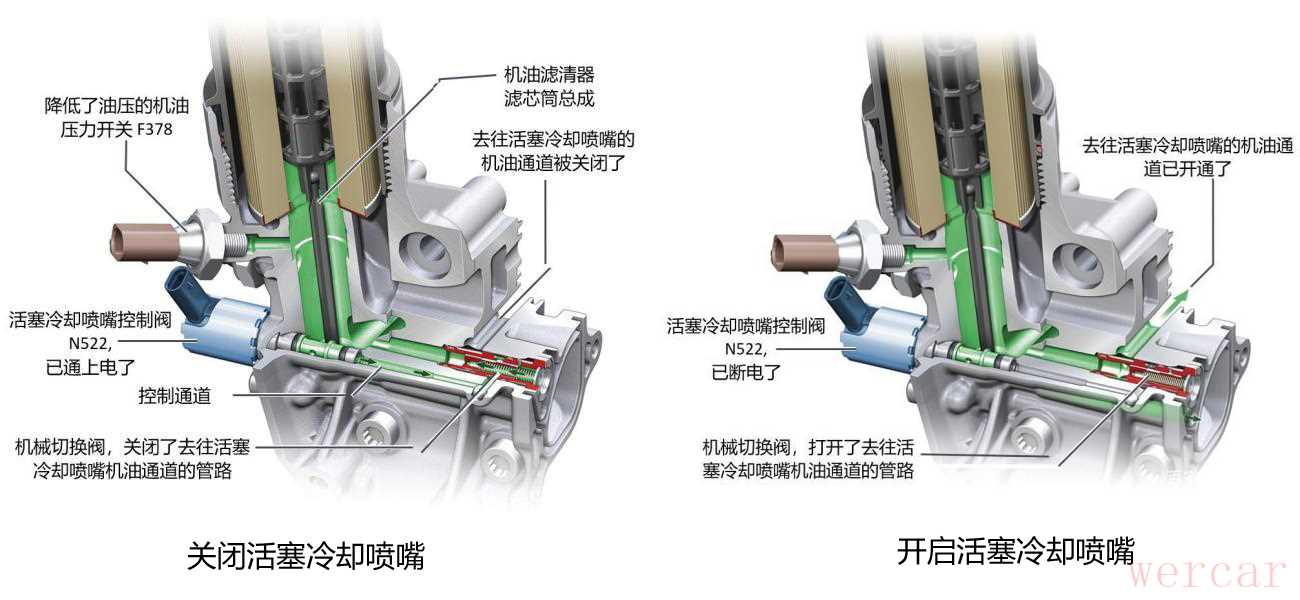 为了解决这一问题,EA888采用了可控活塞冷却喷嘴,发动机控制单元能根据不同工况有针对性地关闭活塞冷却喷嘴,从而提升冷却效率,降低能耗。
