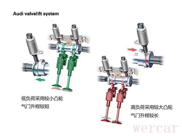 如果气门正时调节是控制发动机“呼吸”的快慢,那AVS系统就是调节呼吸的深浅。AVS全称Audi Valvelift System,从名称可以看出是一项出自于奥迪的技术,AVS系统的本质是可变气门升程技术,基本原理是采用电磁阀驱动的活动销控制凸轮轴上安装的凸轮滑块移动来实现气门升程的切换。Gen3和Gen3B均搭载了AVS系统,但两者是有区别的。
