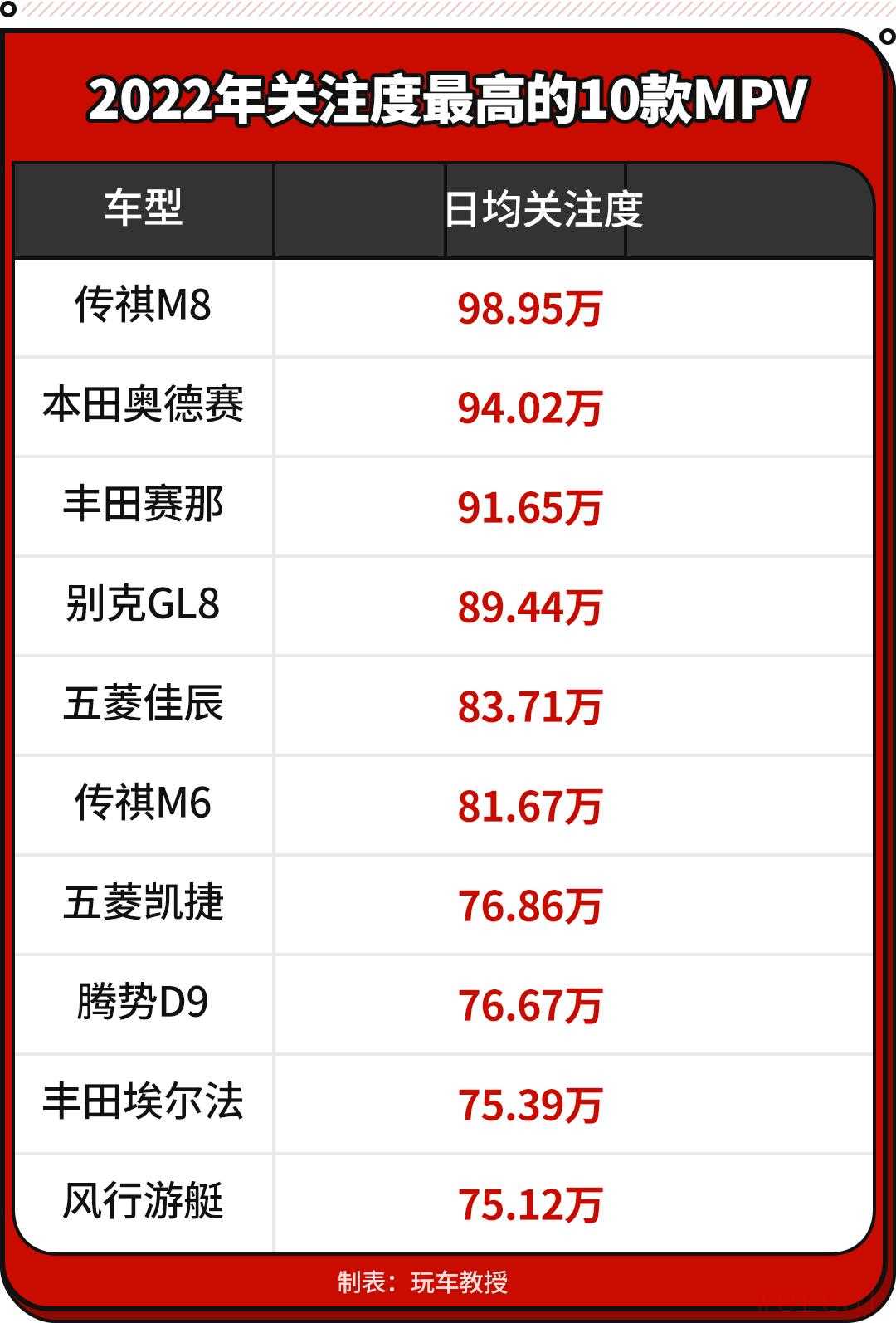 2021年是MPV盛行的一年,众多品牌也加入这一市场,推出了不少高品质、高性价的MPV,其中包括了丰田赛那、起亚嘉华、现代库斯途等重磅MPV,引起市场一片哗然。而在今年,MPV市场热度持续走高,又有新的品牌加入了这场没有硝烟的战争。今天一起来看看当下今关注度前十的MPV,看是否有你心仪的车型上榜?