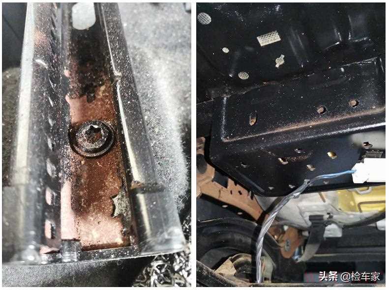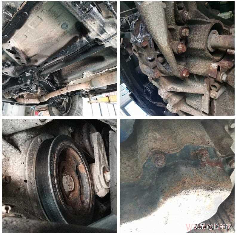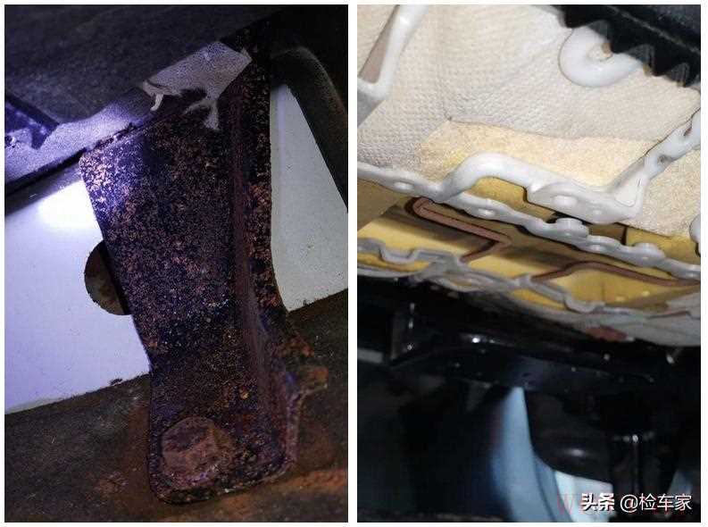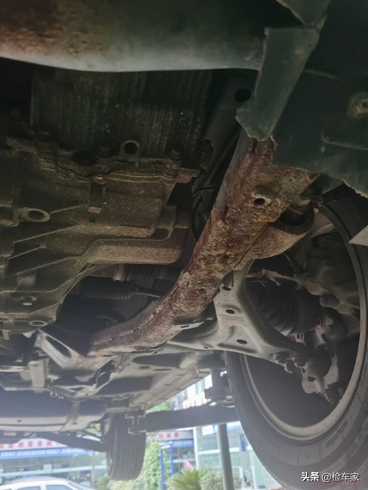 底盘下部被车主买来后已经整备过了,喷上了一层底盘装甲,不过从未曾喷涂的地方还是能看到锈蚀的有多严重,而正是喷底盘装甲的师傅施工完。才给车主说怀疑是泡水车,让鉴定一下。
