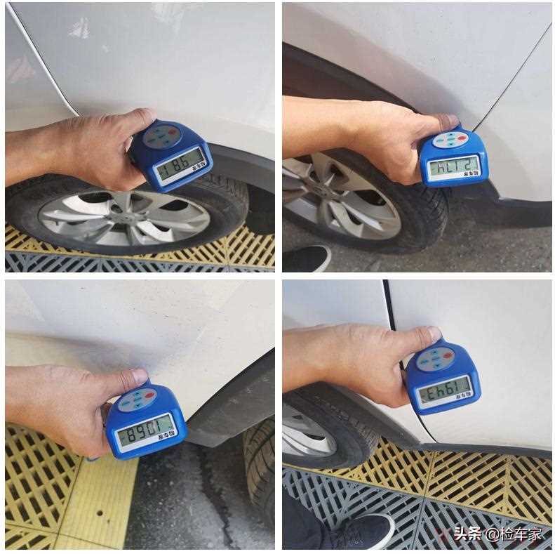 然后拿出漆膜仪上手,整个外观测下来多个面钣金,基本上全车只有少数几个面未曾喷漆,左前翼子板跟左前门有拆卸痕迹,而且钣金修复工艺极差。