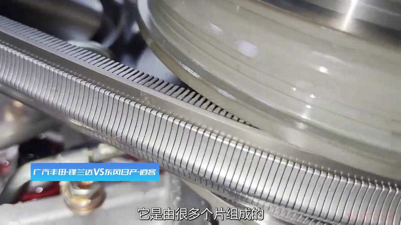 接下来我们先看一下钢链CVT变速箱到底是什么样的。首先它是通过一个一个的小片横着相互网状叠加锁在一起的,做的会很宽。它的结构有点像渔网一样都是相互交织的,你把渔网拉直全部都是交织在一起的,所以说强度是比较高的。