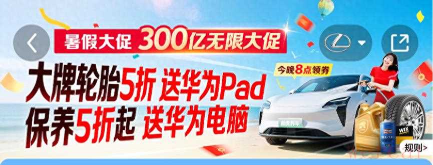 据了解,本轮“300亿无限大促”涵盖了轮胎、保养、喷漆、洗车、打蜡等各类养车产品和服务。以轮胎为例,本次大促的轮胎低至五折,送华为Pad,这样的优惠力度极具吸引力,活动涵盖多个主流轮胎品牌,无论是追求舒适驾乘体验还是强劲操控性能,车主都能以优惠价格选购到合适的产品。在车辆保养方面,途虎推出保养五折起,送华为电脑,品牌涵盖壳牌、美孚、嘉实多、霍尼韦尔、福斯等国际大牌,让车主能以经济实惠的成本享受超高品质保养服务。针对有车身漆面修复需求的用户,途虎在全国范围内推出了品质喷漆148元起的服务,可满足车辆后视镜小范围漆面修复需求。标准面(如保险杠、车门)和拓展面(如机盖、车顶)也分别有289元起和448元起的超低价套餐可选。洗车及相关护理服务同样为车主带来了夏日低价狂欢套餐。虎标快洗、雾化消毒、前挡去油膜三项服务,只需要0.1元即可参与秒杀;标洗服务19.9元就可以享受2次;精洗与打蜡服务价格也十分亲民,精洗低至59元、而打蜡仅需69元。本轮途虎上线“300亿无限大促”,将凭借途虎养车的规模优势惠及更广泛用户。据了解,今年4月途虎宣布途虎养车工场店突破7000家,位居行业领先,覆盖了中国大陆所有省级行政区的 318 个地级行政区以及 1759 个县级行政区,地级行政区覆盖率超 95%。全国车主都能便捷参与这场养车盛宴,进一步激活国内汽车服务市场消费活力。
