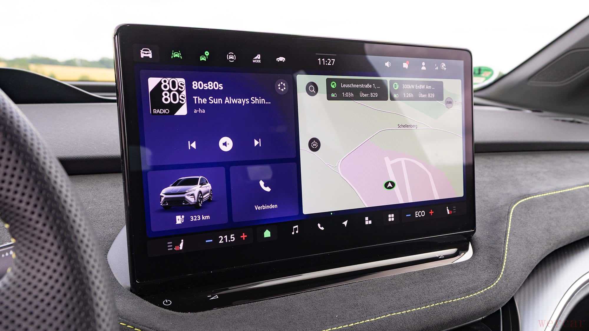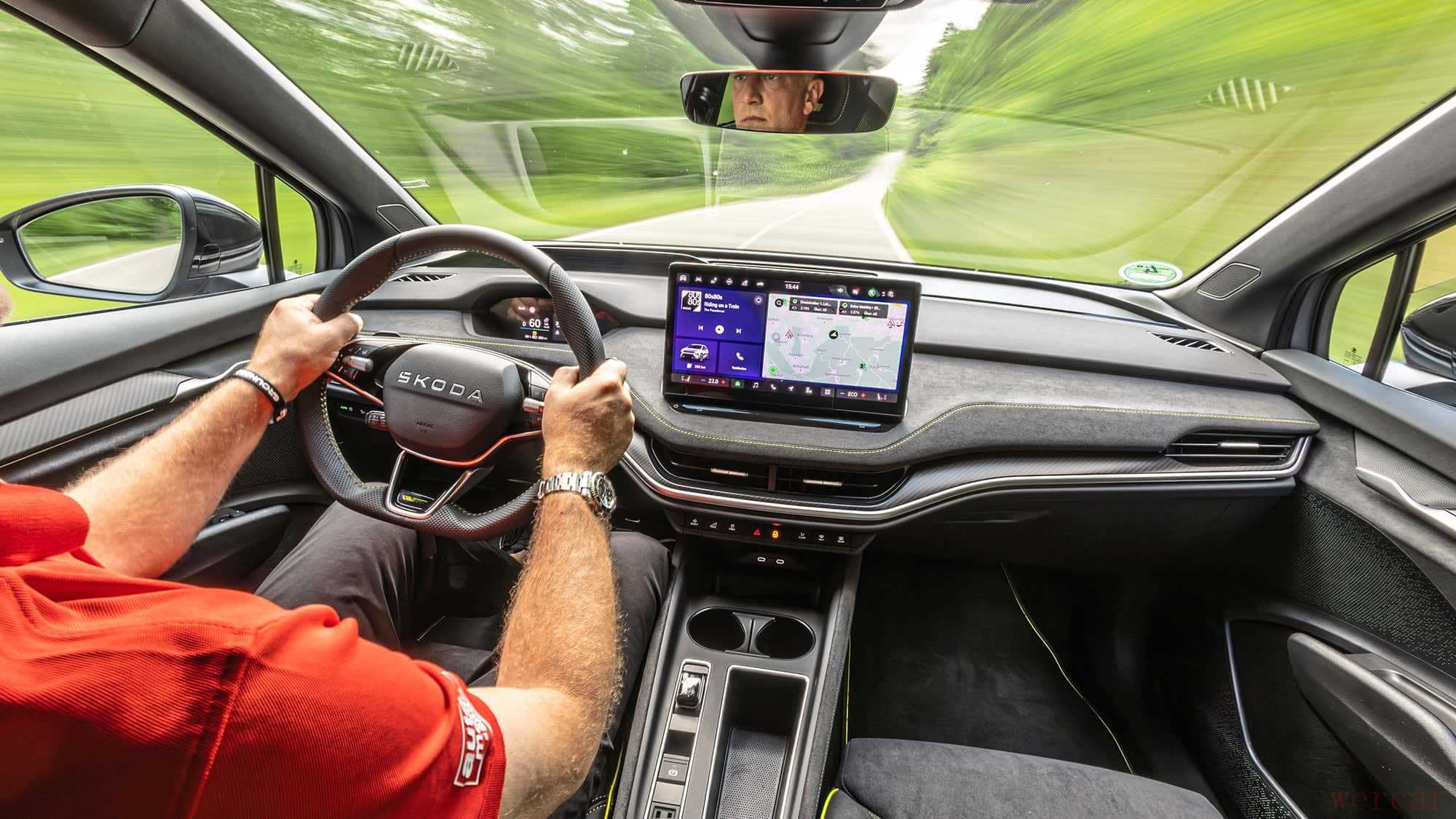 斯柯达Elroq RS搭载了两台电动机,是这三款车中最强劲的一款。它的驾驶感觉几乎不需要任何调整,虽然大屏触摸显示器、各种助手功能看起来很现代,但总体来说,它更像是一款你无需适应的“普通”汽车。对比起来,尽管配置丰富,驾驶者可以很容易上手。