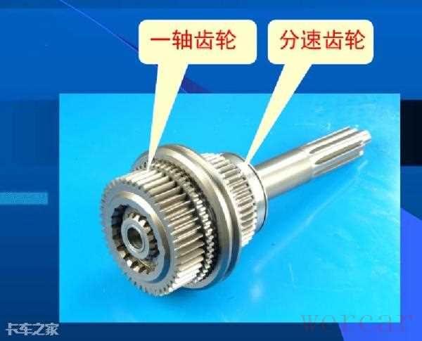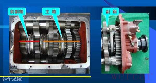 在前副箱的一轴上面空套一轴齿轮和分速齿轮,而两个齿轮中间惯性同步器和一轴则是花键连接。在挡位转换时,惯性同步器的接合套左右移动,分别带动不同的齿轮转动,从而实现挡位变换,这也是前副箱“2”的由来。