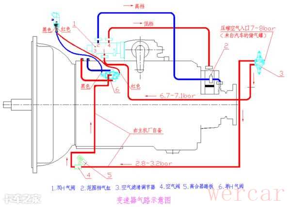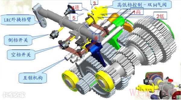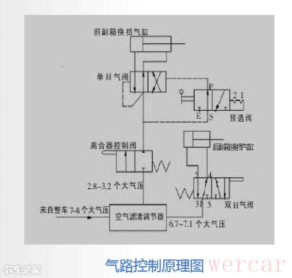 变速箱前后副箱挡位转换由气动控制 主箱挡位变换则由手动完成
