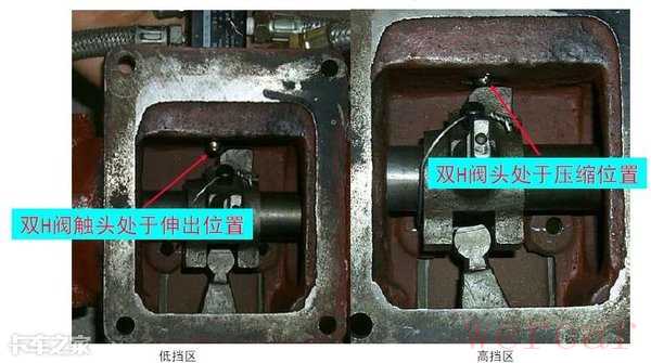 其工作过程为:空气滤清器的气路进入双H阀之后,双H阀触头是由变速箱上的双H操纵装置控制,当阀体上的触头处于伸出位置时,后副箱同步器是和减速齿相啮合处于低挡位区域。