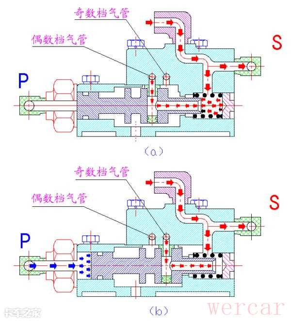 其工作过程是:先进行手柄的预选阀操作,拨动操作手柄上的拨片,迅速踩下离合踏板,这时离合控制器可以把前副箱的气路接通,从而控制单H气阀(也叫随动阀)接通相应的气路,推动前副箱拨叉完成奇偶挡位转换。