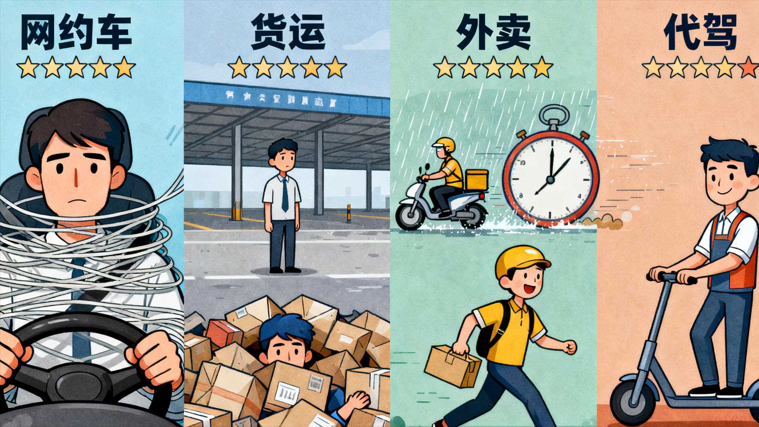 #零工经济生存现状 #网约车行业困境 #外卖员生存压力 #行业困难度对比 #代驾网约车差异 #货运高负债风险 #快递员日常辛苦 #零工从业者权益 #数字劳工困境 #灵活就业真相