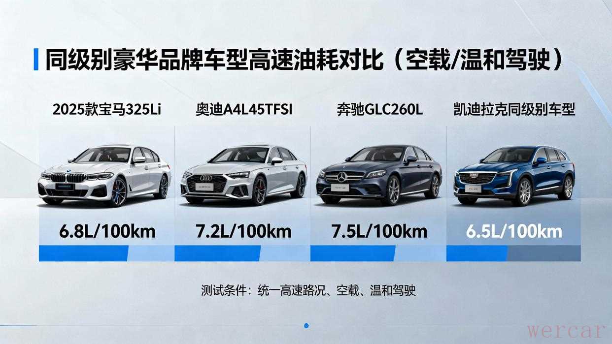 选取2025款宝马325Li、奥迪A4L45TFSI、奔驰GLC260L,与凯迪拉克同级别车型进行油耗对比(统一高速路况、空载、温和驾驶):