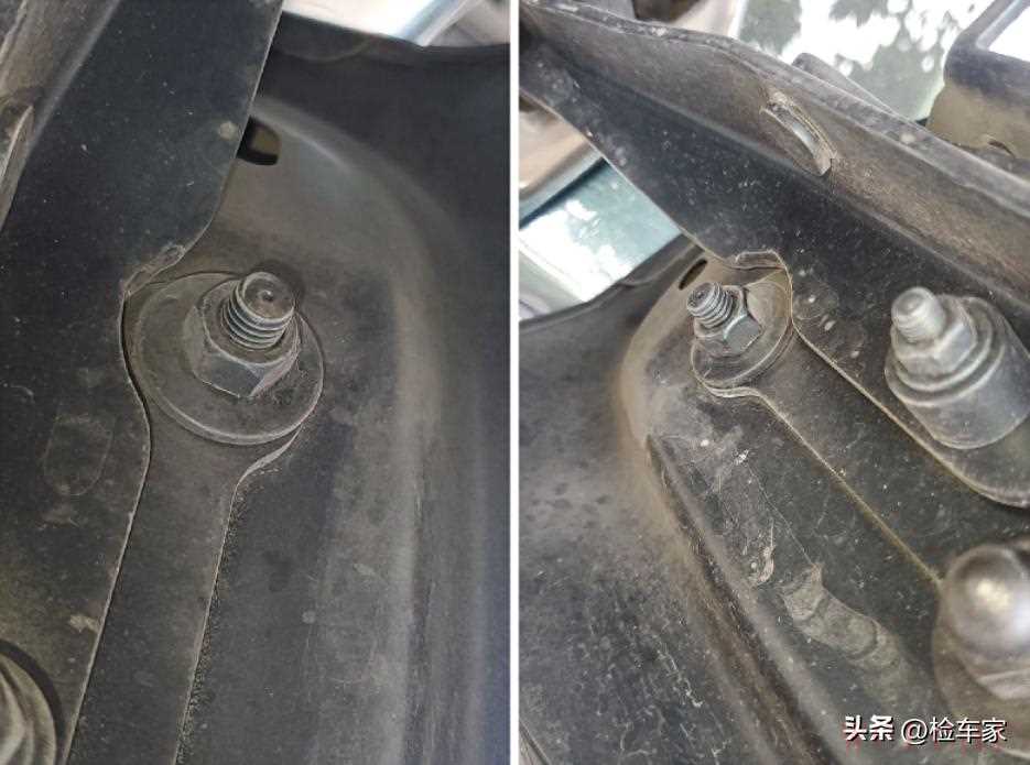 叶子板固定螺丝无拧动无拆卸的痕迹,减震器螺丝也无拧动痕迹,悬挂塔顶平整,结合外观检测,进一步确定车头没有碰撞事故。