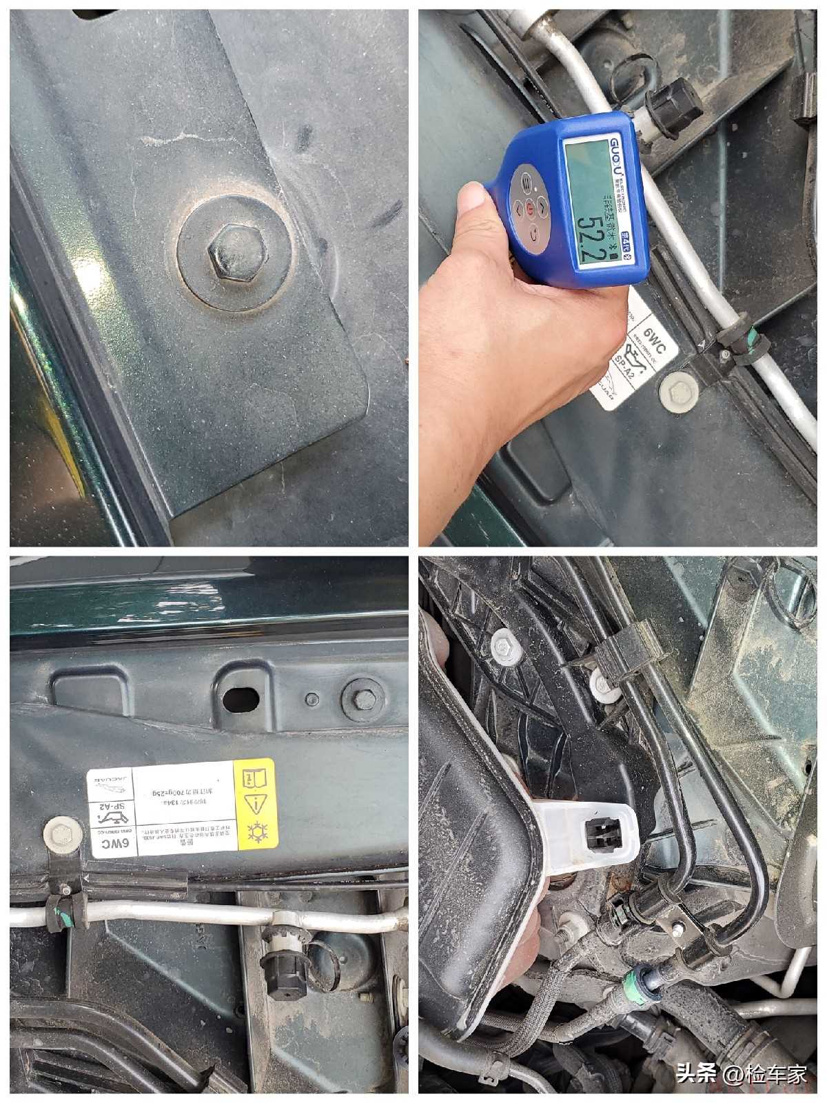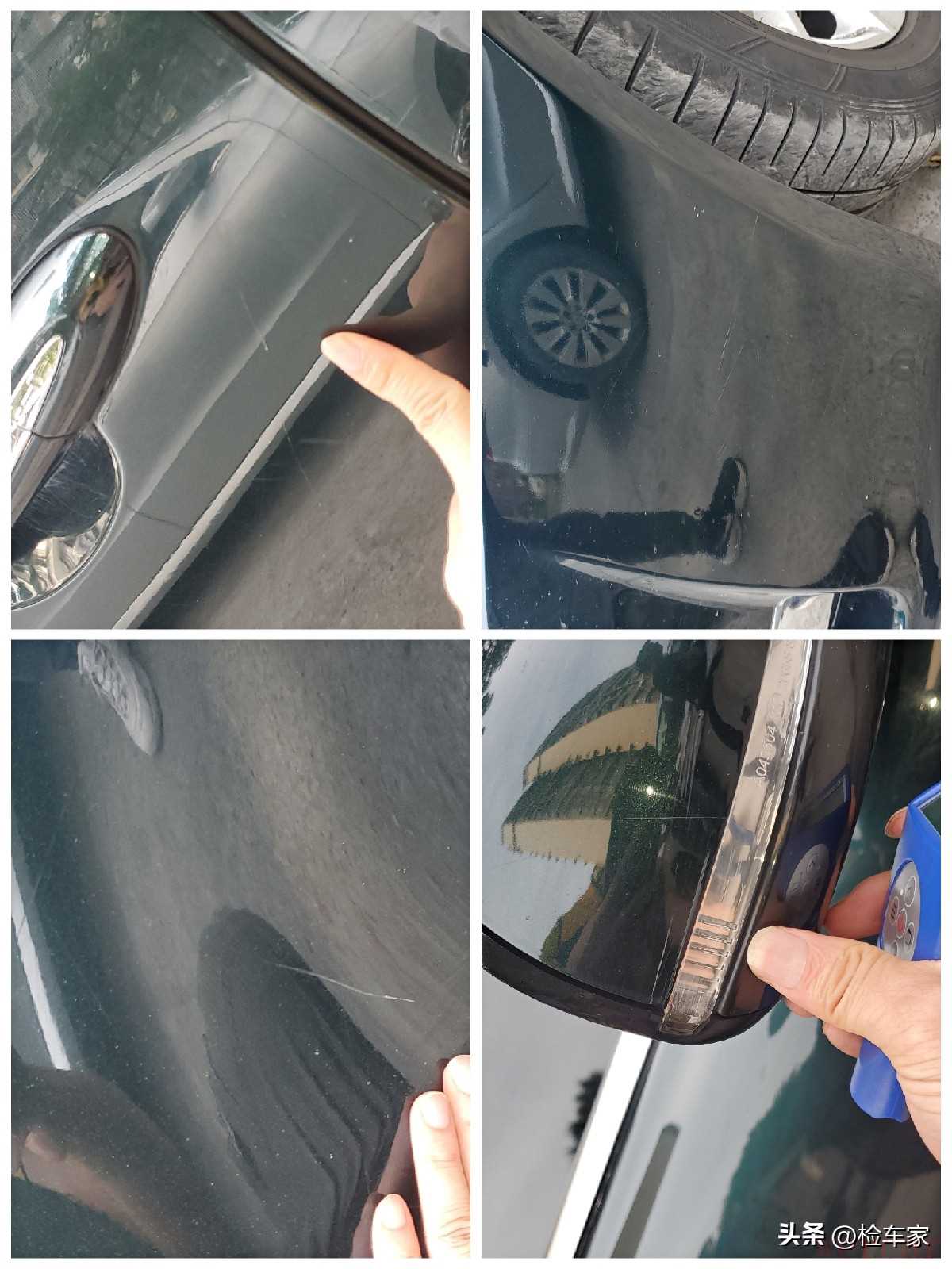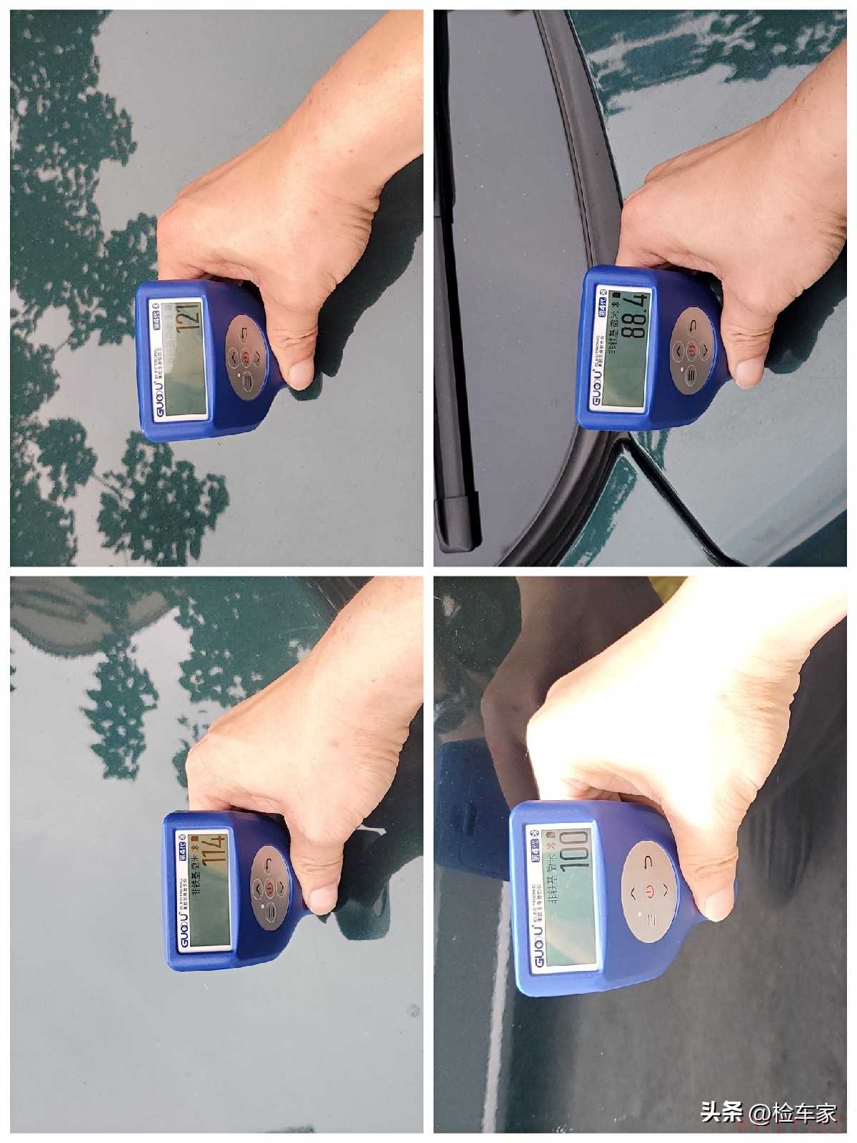 老规矩,从基本的外观漆面开始检测。经过从前到后、从左到右的检测,没有发现车辆外观有喷漆迹象,漆面数字都是在均匀的100左右,数值算是正常的,但是也不能放松检测!