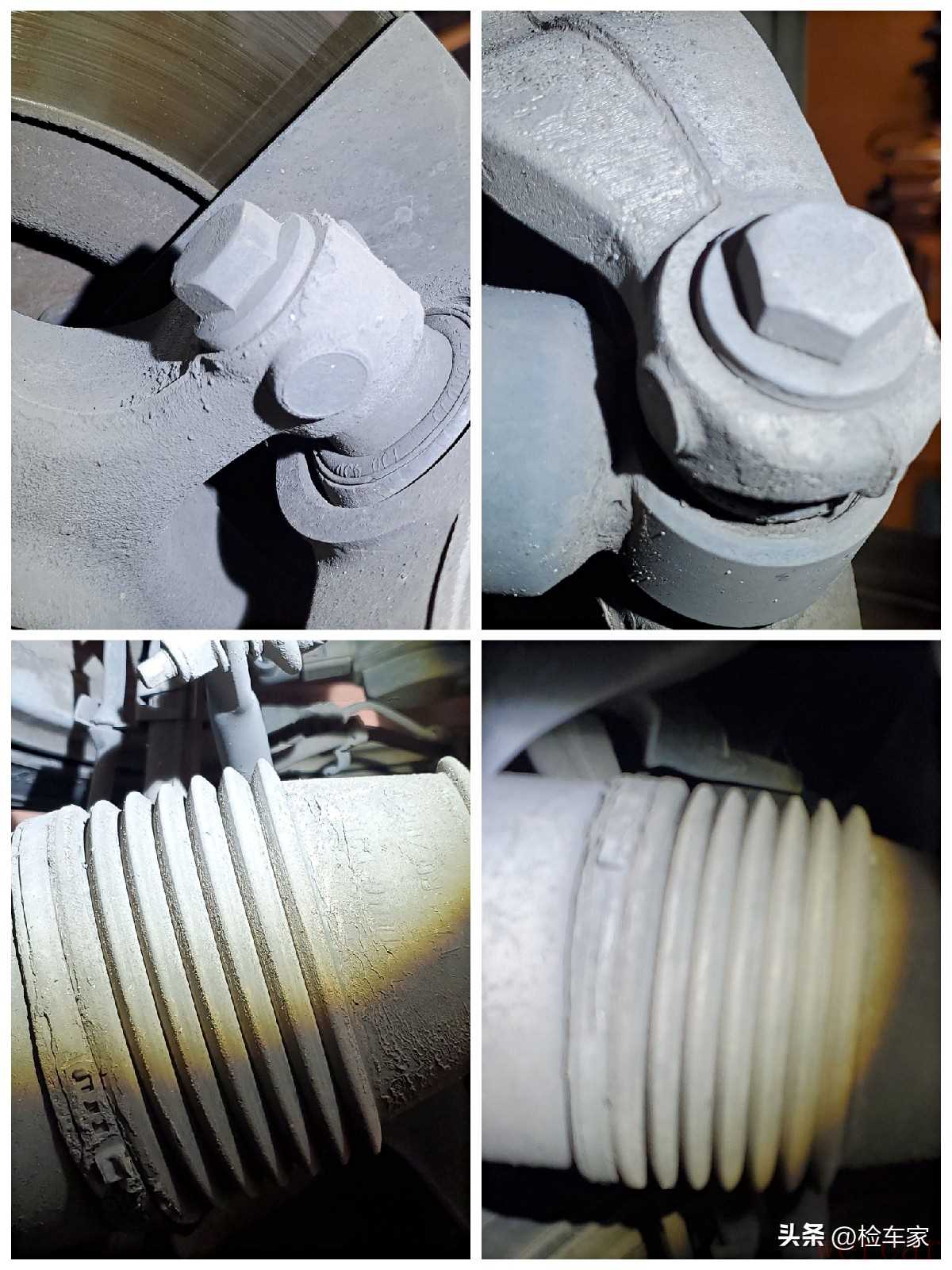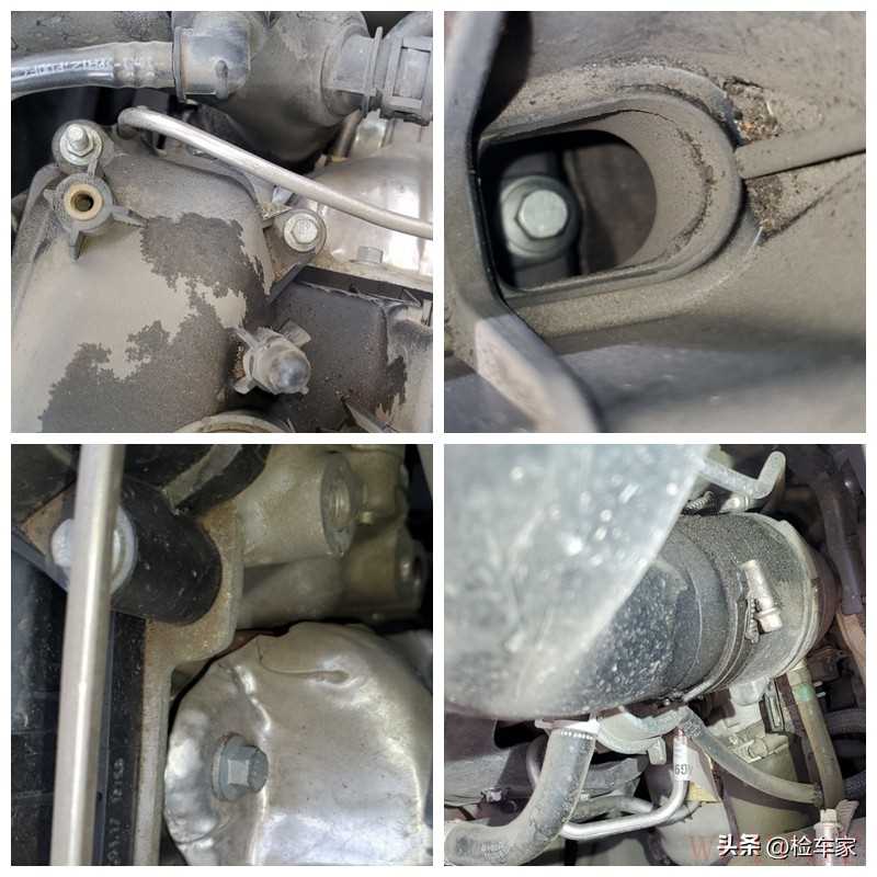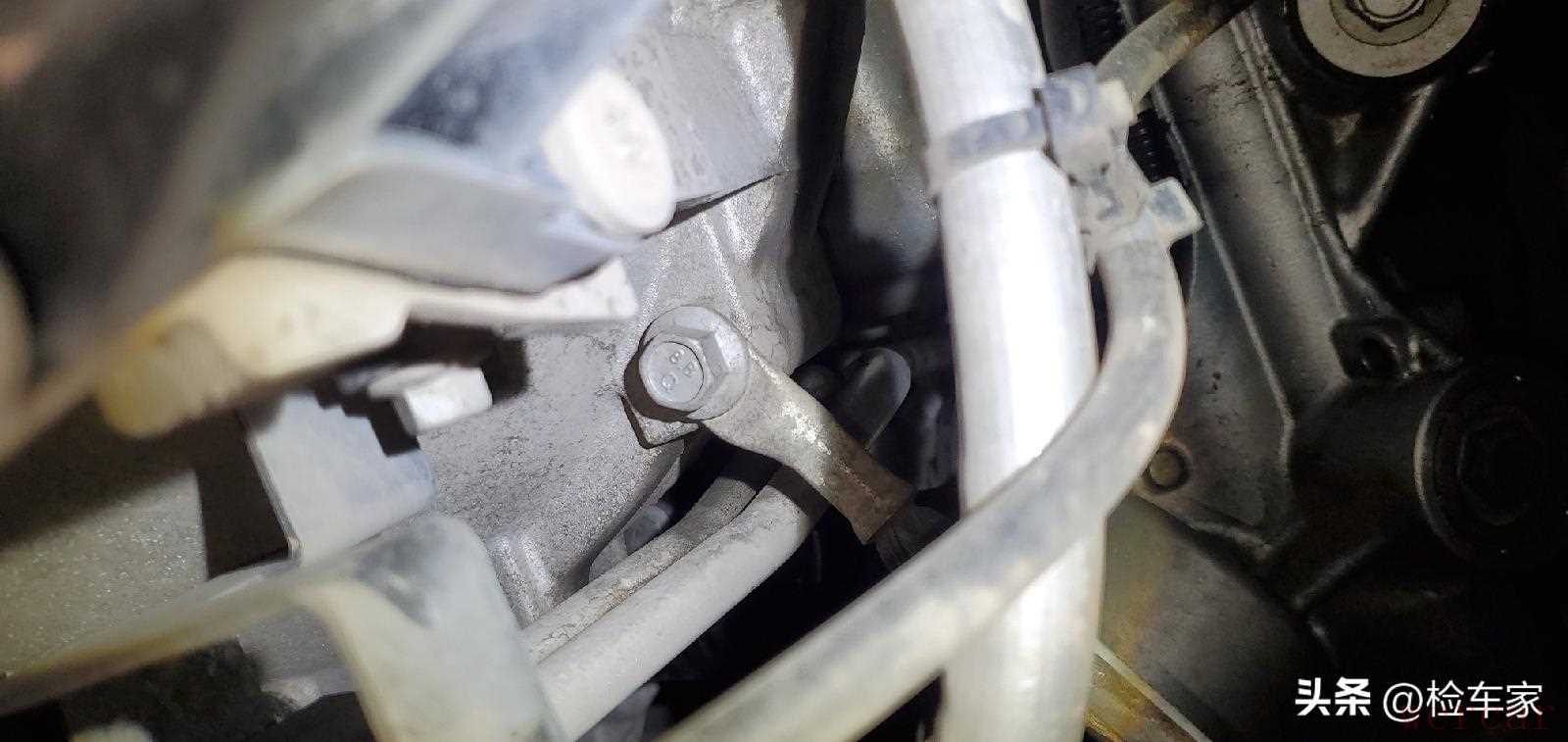 本想在附近的修理厂把车辆升举起来,但是由于车身比较长,修理厂狭窄,找了三个修理厂才找到能举起这辆长轴距车子的举升机,有时候车子太长也不是什么好事啊。底盘部分首先还是检查最重要的发动机,可以看到发动机变速箱结合处固定螺丝无拧动拆卸,无漏油的现象。可以排查发动机有过大修。