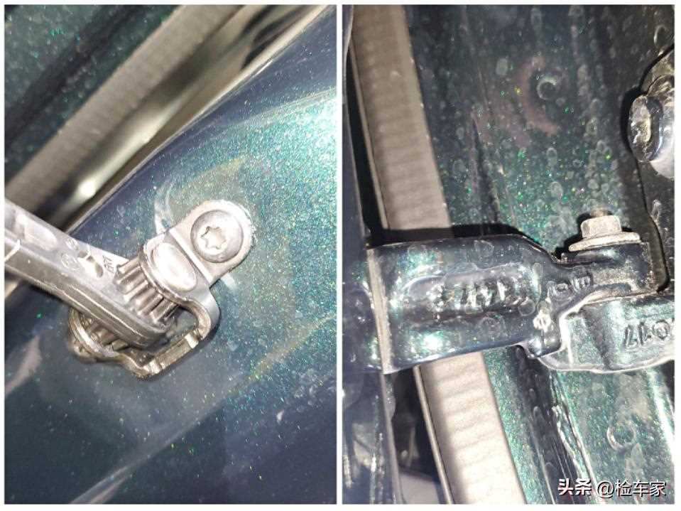 检查车门螺丝无拆卸的痕迹,基本可以排除更换了拆车件。这里跟大家说一个关于车门螺丝拧动的几个因素,车门螺丝有拧动也不一定就是换车门导致,比如说门有剐蹭导致钣金,车门可能移位,所以就会把车门螺丝松开进行调整,所以螺丝就会有拧动痕迹,还有就是有车门下沉,也有可能调整车门螺丝,显然车门下沉的几率也是非常非常小的。