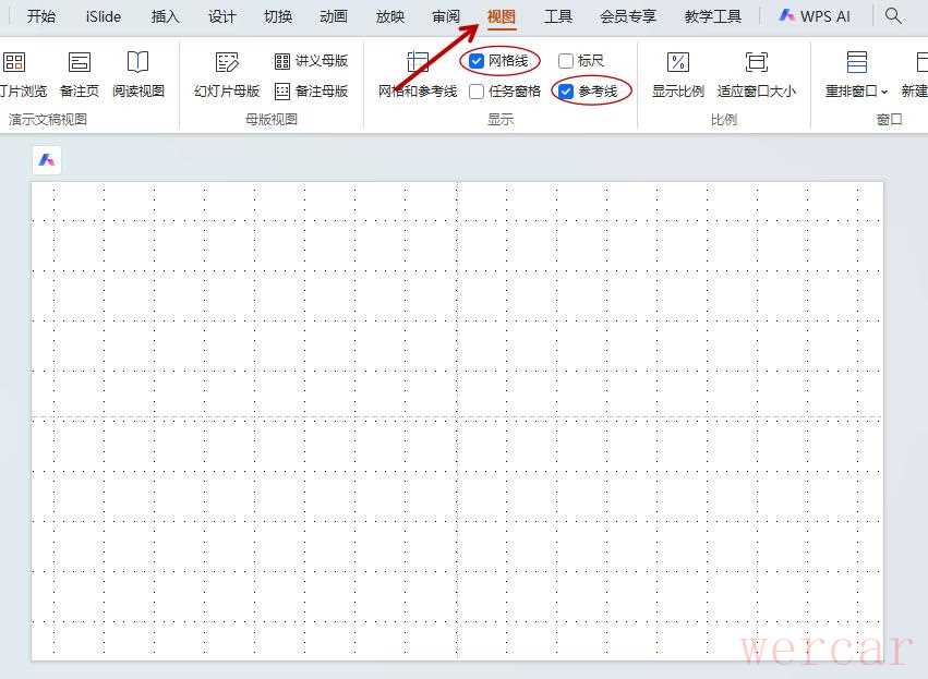 非常简单!点击顶部菜单栏的 【视图】】 选项卡,在【显示】组中,勾选 【网格线】 和 【参考线】 即可。如下图所示。