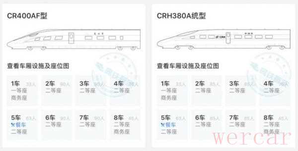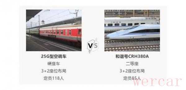 25G型空调车硬座一节车厢比CRH380A二等座多33个坐席;复兴号CRH400AF二等座定员90人,比和谐号多出5个席位。