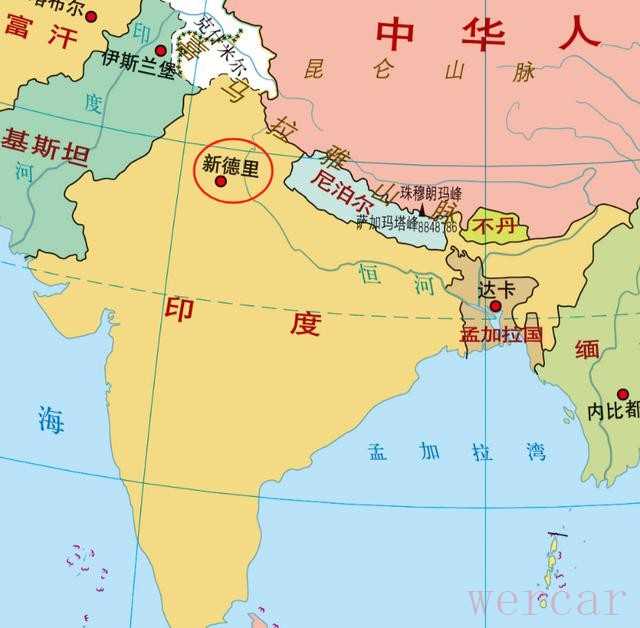 轮到印度,新德里在恒河平原上,但你拉张全国图,它就在左上角。英国人当年怕孟加拉湾台风,也怕南方王公闹事,干脆挨着喜马拉雅修条大林荫道,凉快。