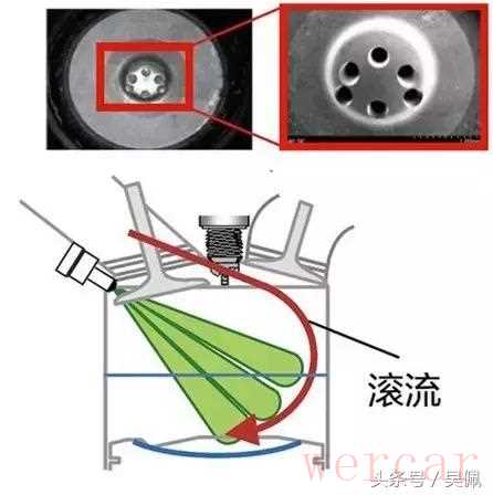 其次,独特的高压燃油喷射器的喷有孔采取了独特的六孔非均匀排列设计,使得燃油进入气缸时也同样能形成滚流,更快更充分地被燃烧。
