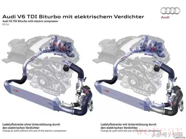 奥迪投入到48V电路系统的第一步,便是发展了电动涡轮增压器。奥迪电动涡轮增压的设计,并没有舍弃传统涡轮增压的特点,完全采用电子驱动,而是被打造成两个独立的部分,两者相辅相成。