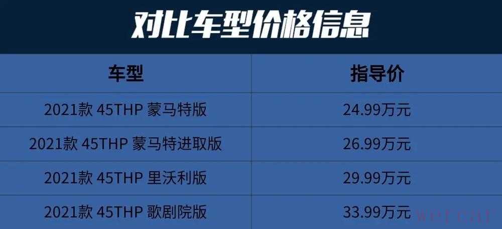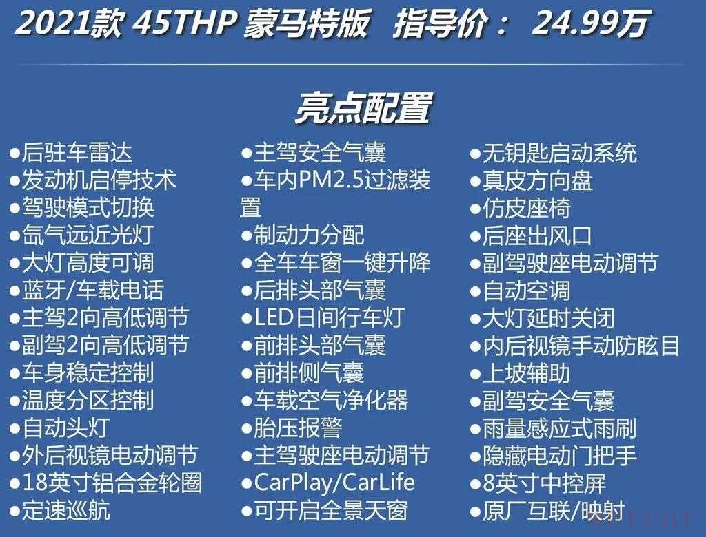 其次推荐的是2021款 45THP 蒙马特版,作为全系的入门车型,它的基础配置足够丰富,像真皮方向盘、自动空调、前排座椅电动调节等配置应有尽有,同时动力系统也与高配车型没有区别。如果你更注重产品的价格的话,那么购买该版本车型还是很划算的。