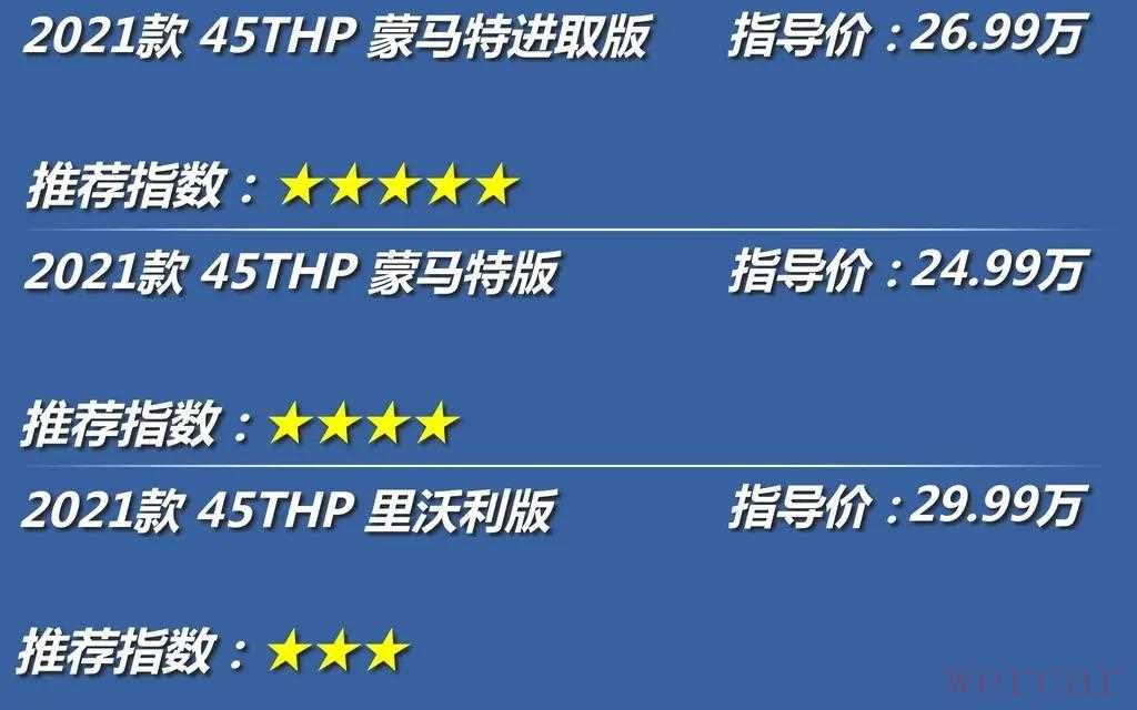 在车型推荐环节,我认为2021款 45THP 蒙马特进取版最值得推荐,原因就是该版本车型的增配项更加丰富,多花两万元,就增配了并线辅助、全液晶仪表、倒车影像等现实生活中比较实用的配置,性价比还是很高的。