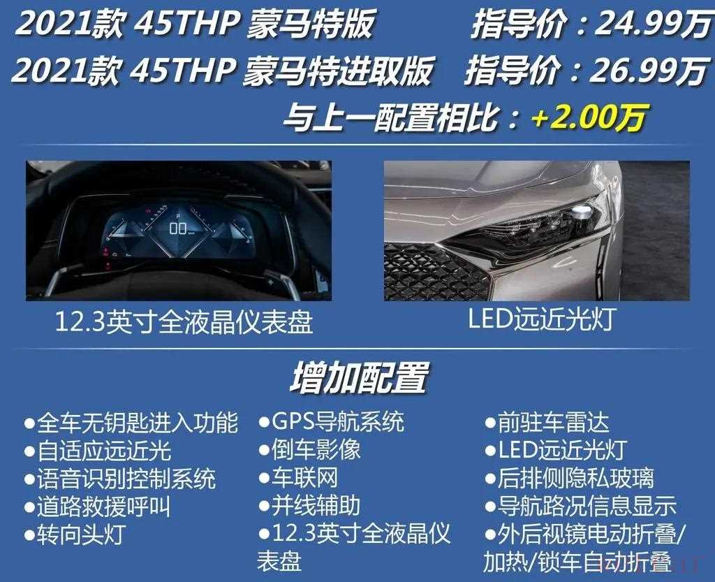 DS 9 2021款 45THP 蒙马特进取版相比2021款 45THP 蒙马特版增加了LED大灯、道路救援呼叫、导航路况信息显示、倒车影像、12.3英寸全液晶仪表盘、车联网、前驻车雷达、全车无钥匙进入功能等配置。多花2万元,增加了更为丰富的安全性以及舒适性配置,性价比还是很高的。