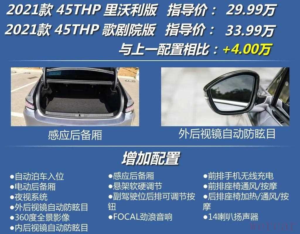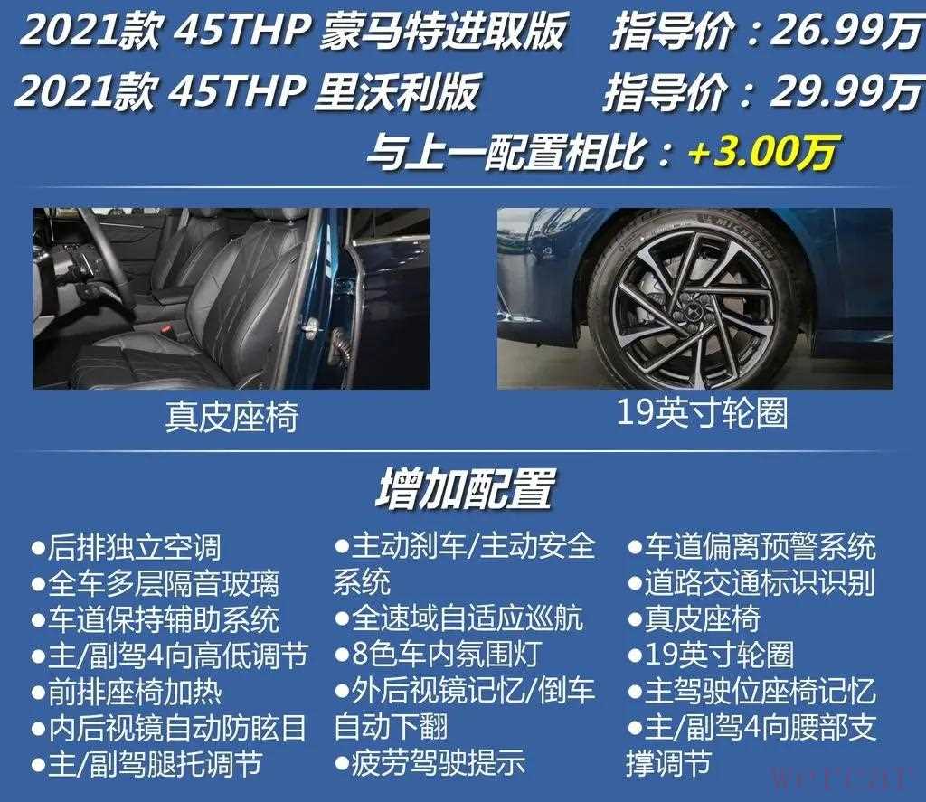 最后推荐的是2021款 45THP 里沃利版,该版本车型在配置方面的表现更进一步,增配了8色车内氛围灯、全车多层隔音玻璃、真皮座椅等一众舒适性配置,如果你的购车预算充足,那么多花一些钱来提高一下用车体验也未尝不可。