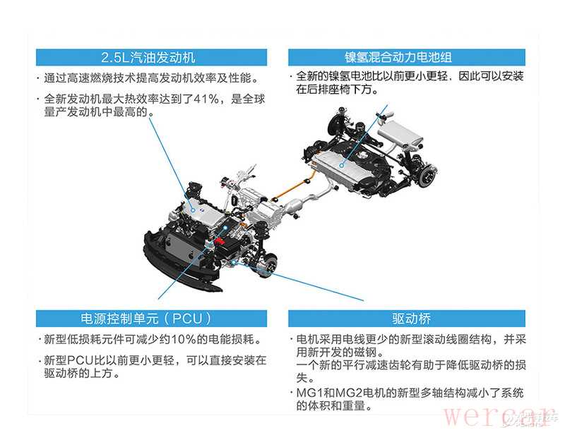 汽油机型号A25B,热效率41%的那台自吸神机,MG1和MG2两颗电机安装在E-CVT结构当中,储能装置是后排乘客屁屁下方置放的镍氢电池包。