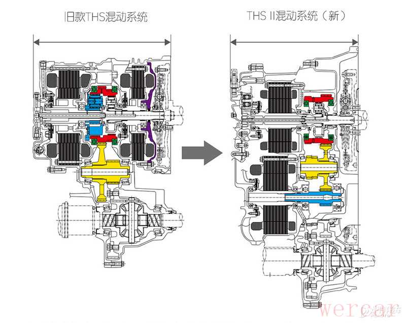 利用A25B组合成第四代THS Ⅱ双擎混动系统,这套新型THS系统的电机布局特征是:MG1与MG2改成了异轴布置,整体宽度更窄,更容易装机使用。