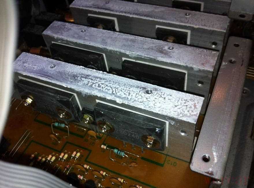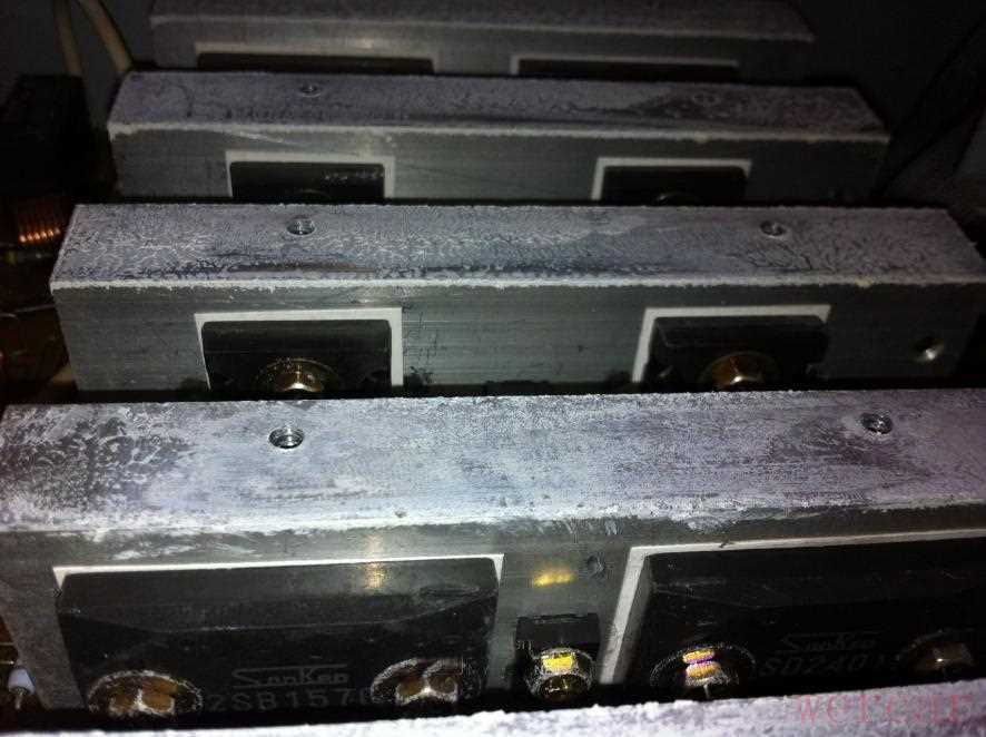 拆掉主散热器后,下面其实还有通过散热硅脂连接的5组小散热器,上面分别安装着5组功放对管: