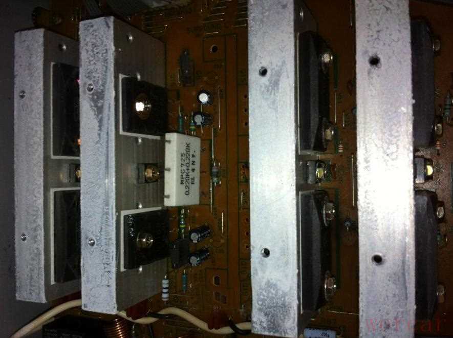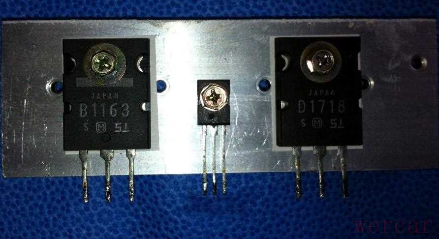 可以看到5组对管不完全一样,有3组是功率很大的MT-200封装的2SB15709和2SD2401达林顿对管,用于左右主声道和中央声道,另外两组是小一点的TO-3PL封装的2SB1163和2SD1718对管,用于环绕声道: