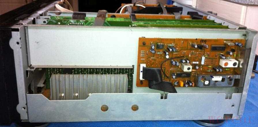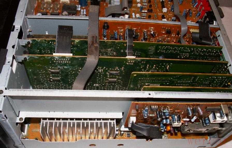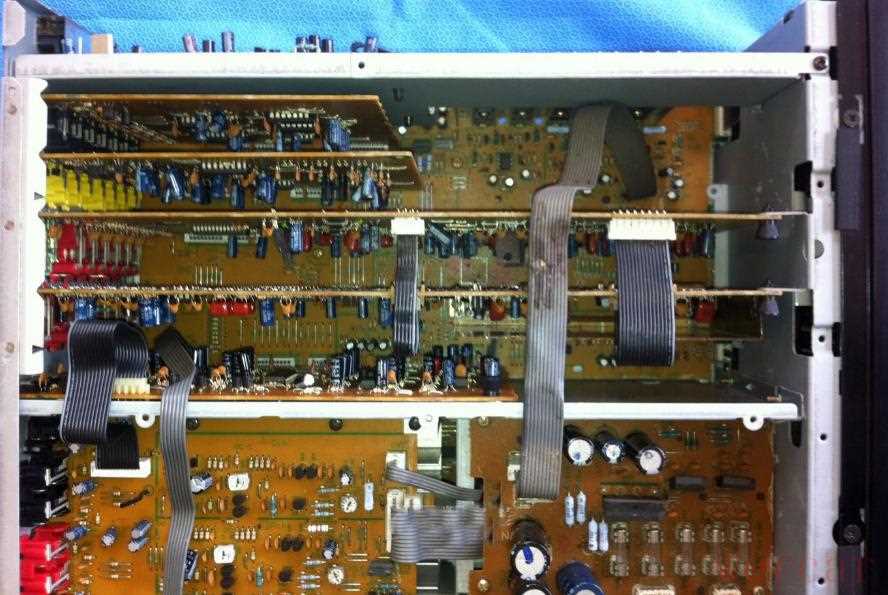 首先拆掉上盖,这个很简单。拆开上盖,里面的东西就看见了,好多电路板插在一起,横的竖的一大堆: