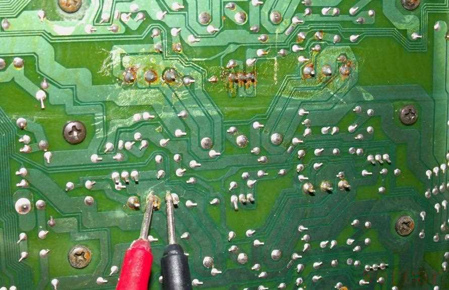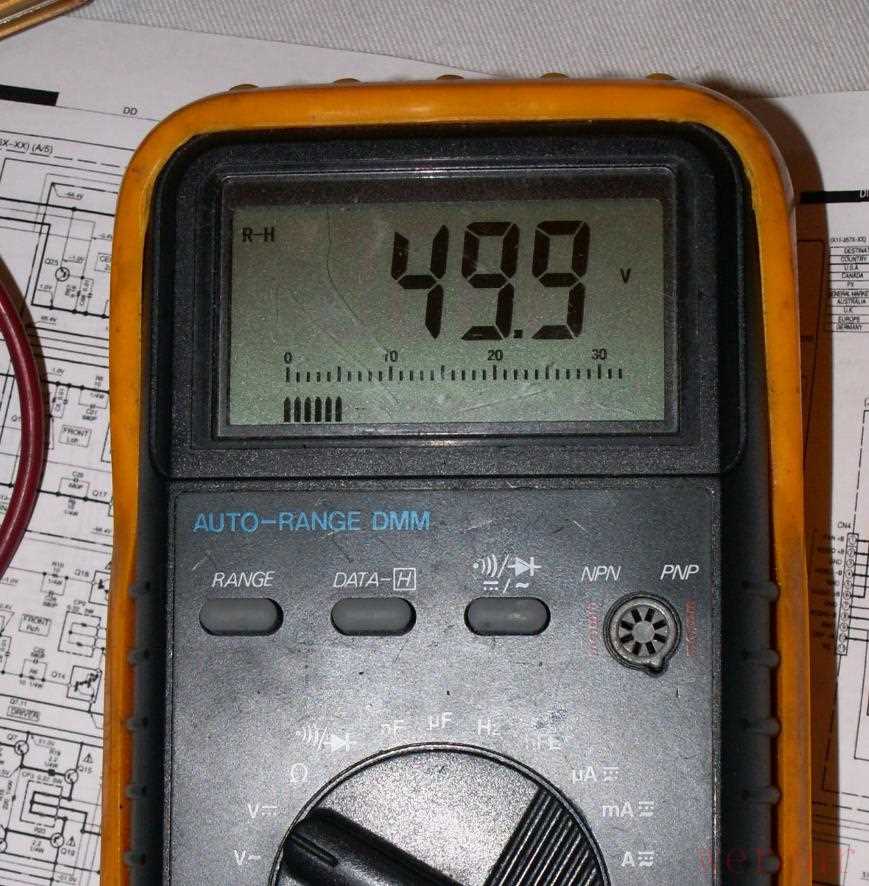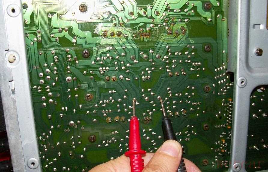 因为已经强制解除了功放保护电路,音箱继电器被打开,所以测中点电压直接在功放外壳上的音箱连接端子上测就可以了,不必再在拥挤的电路板上测,依次测量5路功放音箱红色端子的电压,发现都为0,直到测到最后一个环绕左声道时中点电压达到50V!这说明环绕左声道肯定坏了。