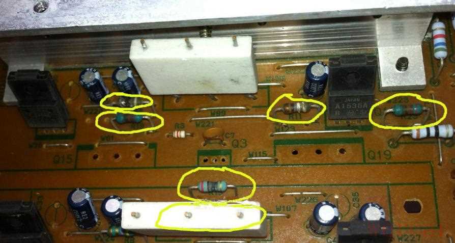 除了三极管烧毁外,功放后级电路中大功率三极管周围的电阻在大电流下一般也都会同时被烧毁,检测发现这些画圈的电阻都烧掉了,大部分肉眼都能看到烧焦的痕迹: