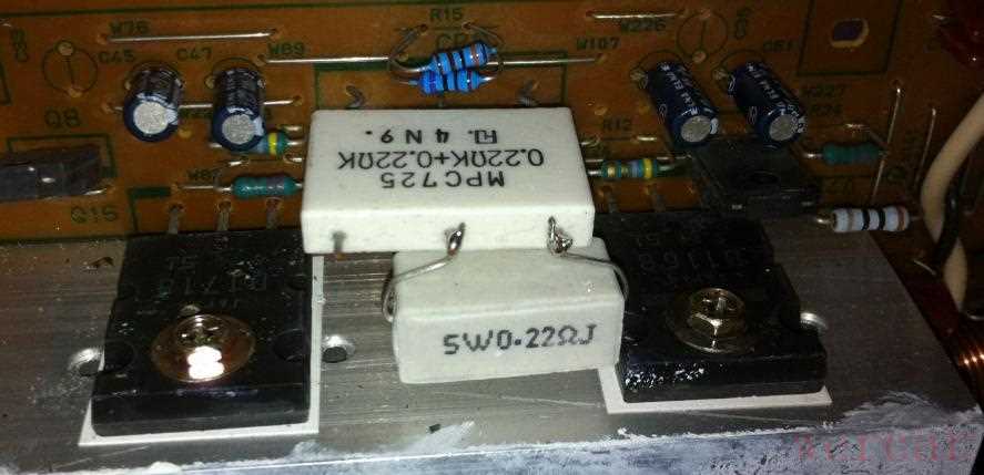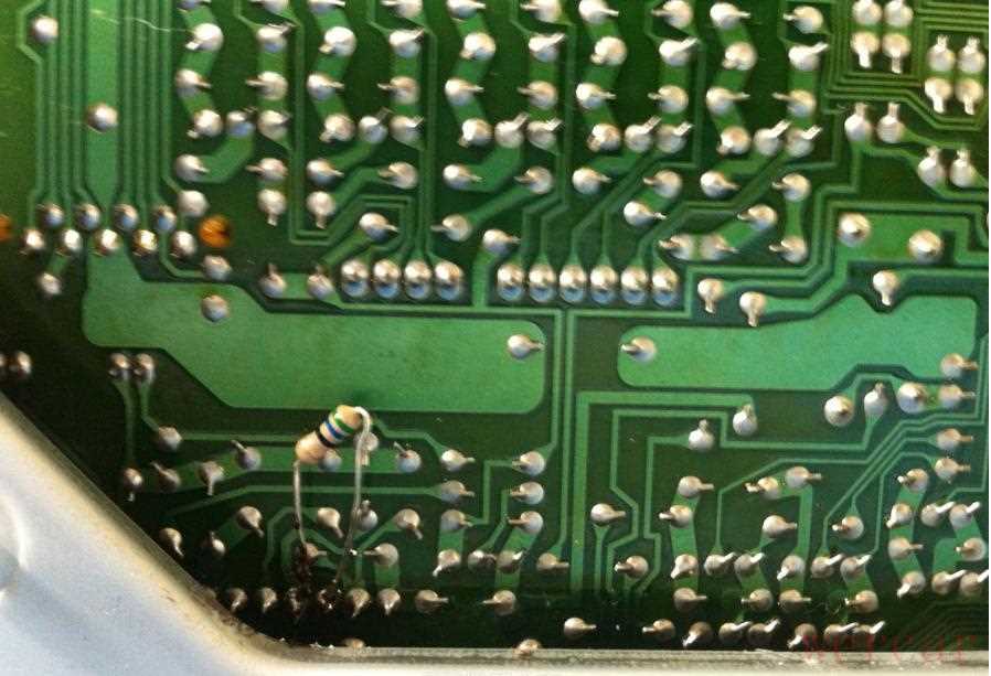 把烧掉的电阻全部换掉,其中那个白色方块的大电阻是双电阻,内部包括两个串联的0.22欧姆电阻,这里只有一个坏了,所以可以在外面并联一个0.22欧姆5W的水泥电阻修复: