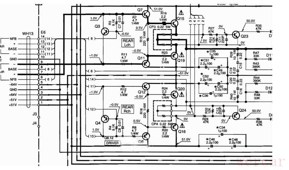 先把环绕左声道部分的功放电路找出来,功放输出部分很简单,两个大功率对管Q15、Q19前面有一对电流驱动管Q7、Q11,再前面则是一个静态偏置电流控制管Q3,非常经典的OCL电路设计.