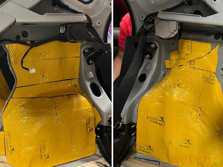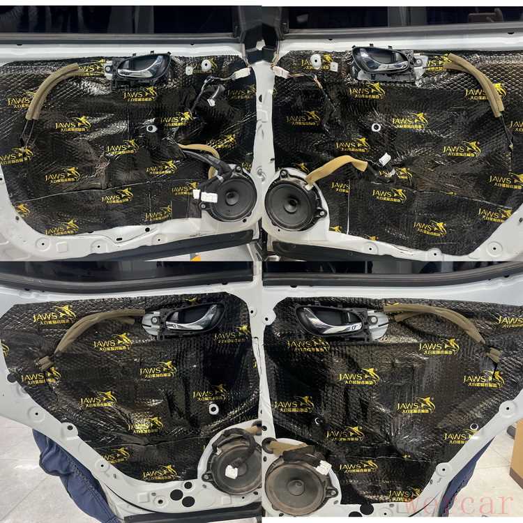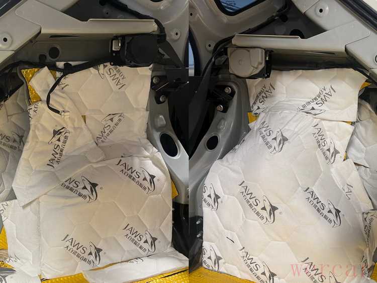 经过检测,技师发现原车的噪声主要有风噪和空腔共鸣两种,因此技师使用大白鲨系列隔音材料,对汽车的四门、后备箱和后轮毂等部位,做了针对性的隔音处理。