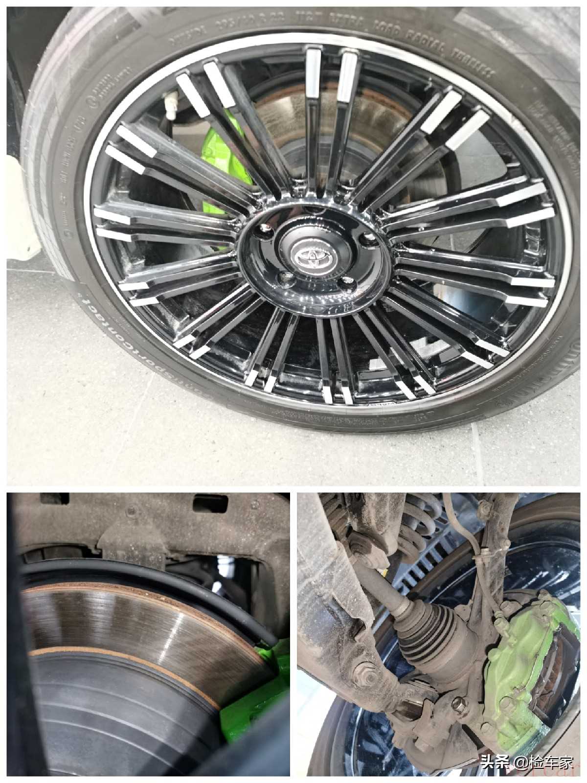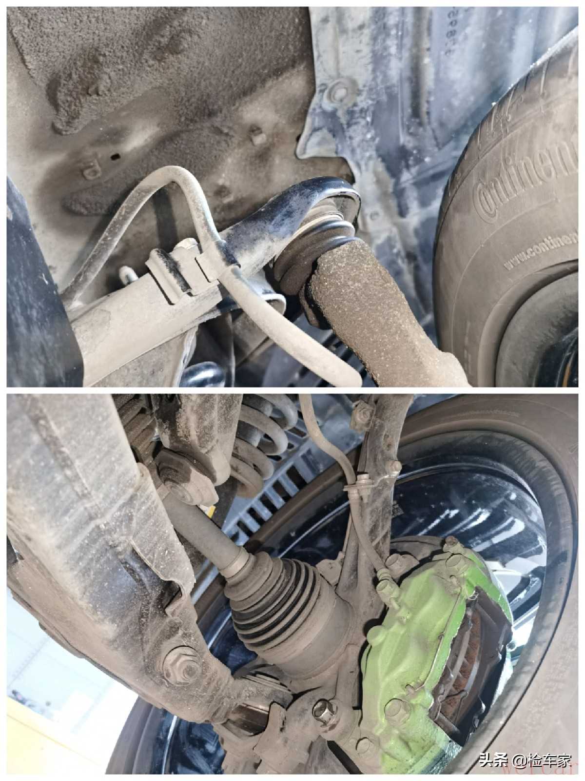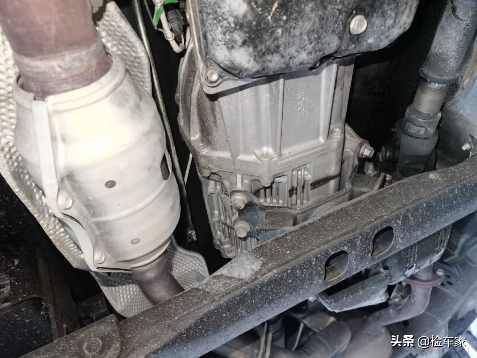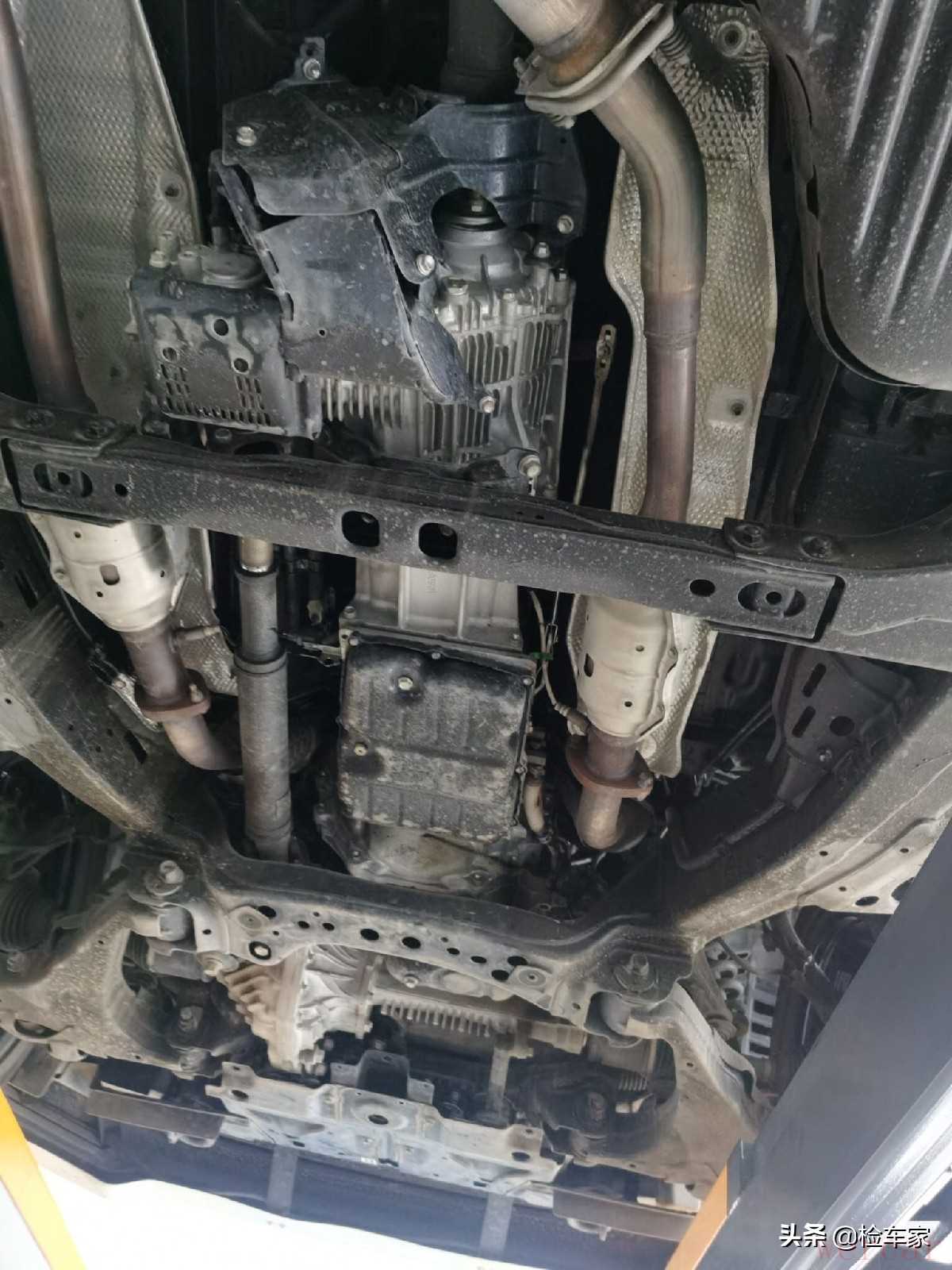 我检测所在的车行就有举升机,所以车子十分顺利地就顶了起来。通过底盘情况可以看出,车身的底板横梁纵梁什么的都没有剐蹭和变形的情况。这也说明了这台车极限越野的可能性十分小。