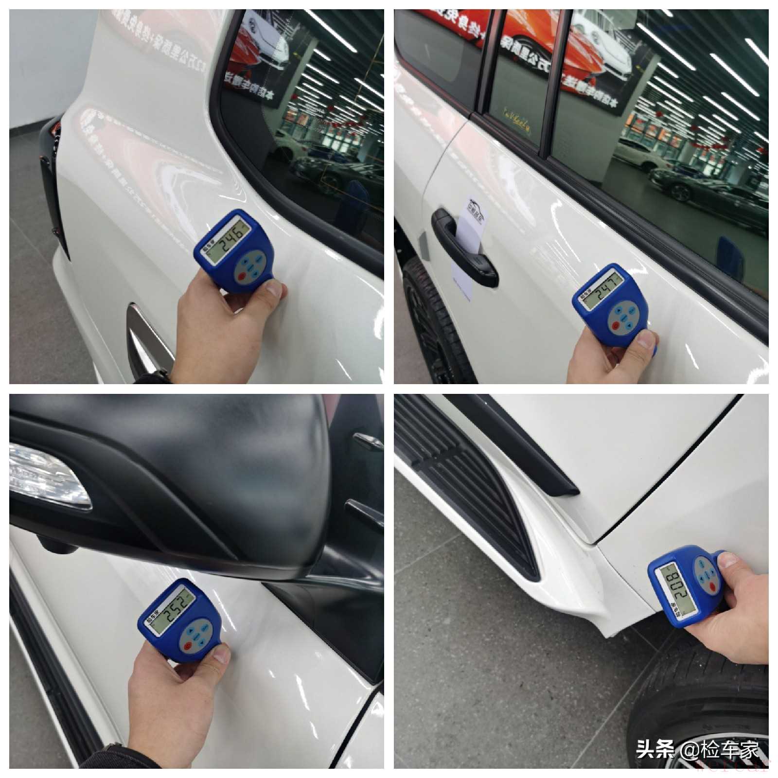 用同样的手法把右侧也检测一遍,也得到了相同的结果。这让我不得不好奇为啥会这样了。但是很快车商给出了答案。这台车以前有贴过车膜,不知道是因为车膜的质量太差还是什么原因,再把车膜扯下来的时候发现,表面的油漆都受到损伤,为了好看一点,车商只得从新喷漆修复了。